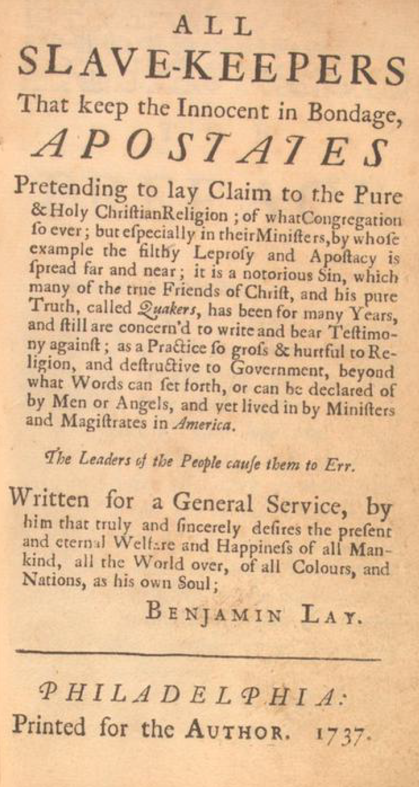 American leader Benjamin Franklin, Lay’s most famous pamphlet was All Slave-Keepers That Keep the Innocent in Bondage, Apostates, in which he attacked slaveholders and advocated for the abolition of slavery. He said that it was the duty of all Christians to fight against it. His widely read—but controversial—pamphlets proclaimed the evils of slavery and give lie to the excuse of some that slavery was simply accepted by all in those days.